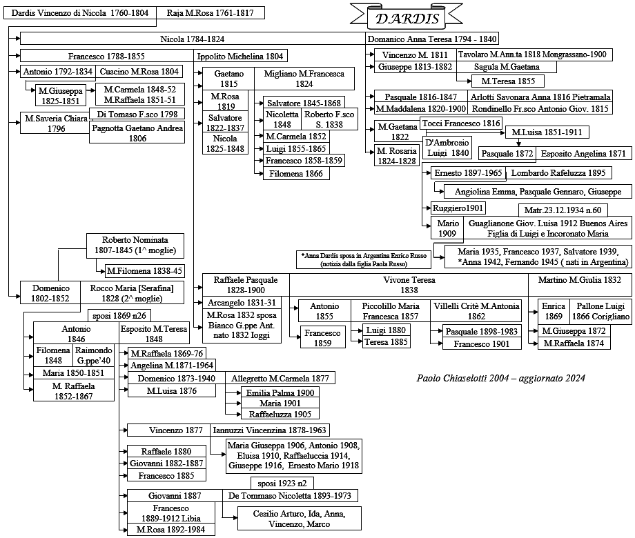 The surname Dardis or D'Ardis (it indicated the same families) is present since the first birth and marriage registers, that date back to 1809 and 1811. We found two greater families, here represented, and some more little ones perhaps tied to the first.