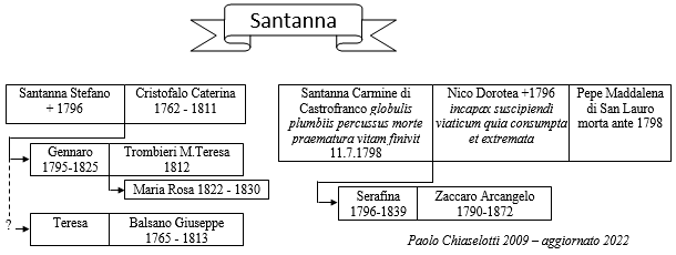 Il cognome Santanna, scritto anche S.Anna, compare agli inizi dell'Ottocento con un piccolo nucleo familiare conseguente al matrimonio di Gennaro Santanna con Maria Teresa Trombieri e la nascita della loro unica figlia Rosa avvenuta nel 1822.